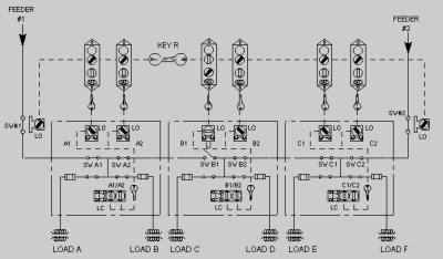 Some Typical Key Interlock SchemesScheme A: To prevent the paralleling of two independent sources.Initial Conditions: The load is fed from line 2 through switch 2 which is normally closed with its respective interlock key "A" captive. Switch 1 is locked open with no interlock key present. Switching the load to line 1 through switch 1: Open switch 2 and lock thereby releasing the "A" key. Use the "A" key to unlock and close switch 1. Reverse to restore the initial condition. Scheme H: Preventing the paralleling of two independent sources through the tie breaker while allowing the switching of sources to the load(s).Initial Condition: Line A feeds load A through breaker #1 which is normally closed with its interlock key "A" captive. Line B feeds load B through breaker #2 which is normally closed with its interlock key "A" captive. Breaker #3 is locked open with no interlock key present. Switching scenario #1: Line A feeding both loads through breaker #1 and breaker #3: Open and lock breaker #2 thereby removing the "A" key. Use the "A" key to unlock and close breaker #3. Reverse to restore the initial condition. Switching scenario #2: Line B feeding both loads through breaker #2 and breaker #3: Open and lock breaker #1 thereby removing the "A" key. Use the "A" key to unlock and close breaker #2. Reverse to restore the initial condition. Scheme H2: Preventing the paralleling of any of the sources while allowing the switching of the loads to alternate sources.Initial conditions: Utility feed A supplies load A through breaker #1 which is closed with its interlock key "A" captive. Utility feed B supplies load B through breaker #4 which is closed with its interlock key "B" captive. Breakers #2, #3, and #5 are locked open with no keys present in their respective interlocks. Switching scenario #1: Supplying loads A and B by utility feed A(B) through breaker #1(#4) and breaker #5: Open and lock breaker #4(#1) thereby removing the "B"("A") key. Use the "B" ("A") key to unlock and close breaker #5. Reverse to restore the initial condition. Switching scenario #2: Supplying loads A and B by generator 1(2) through breaker #2(3) and breaker #5: Open and lock breaker #1(#4) thereby removing the "A"("B") key. Use the "A" ("B") key to unlock and close breaker #2(#3). Open and lock breaker #4(#1) thereby removing the "B"("A") key. Use the "B"("A") key to unlock and close breaker #5. Reverse to restore the initial condition. Switching scenario #3: Generator 1(2) supplying load A(B) through breaker #2(#3): Open and lock breaker #1(#4) thereby removing the "A"("B") key. Use the "A"("B") key to unlock and close breaker #2(#3). Open and lock breaker #4(#1) thereby removing the "B"("A") key. Use the "B"("A") key to unlock and close breaker #3(#2). Reverse to restore the initial condition. Note: The key interlock on breaker #5 is dual combinated and can accept either an "A" or a "B" key. Uninterrupted power source scheme 1: To insure the proper sequential operation of UPS related equipment.Initial Condition: The critical load is fed through the UPS through the UPS output breaker. The Solenoid Key Release Unit (SKRU) has its respective interlock key "A" captive with its internal form C contacts in position A. The maintenance bypass breaker is locked open with no "A" key present while the "B" key is captive. The UPS output breaker is closed with no "B" key present while the "A" key is captive. Switching Scenario: Supply of the critical load through the UPS maintenance bypass breaker: The UPS is placed in the bypass mode. Upon completion a signal is sent to the SKRU enabling release of the "A" key while placing the internal form C contacts into position B. Use the "A" key to unlock and close the maintenance bypass breaker thereby trapping the "A" key and releasing the "B" key. Open and lock the UPS output breaker using the "B" key which will trap the "B" key and release the "A" key. Re-insert and "A" key in the SKRU and turn, thereby trapping key A and returning the form C contacts to position A. Reverse to restore the initial condition. Uninterrupted power source scheme 2: To insure the proper sequential operation of UPS related equipment.Initial Condition: The critical load is fed through the UPS through the UPS output breaker. The Solenoid Key Release Unit (SKRU) has its respective interlock key "A" captive with its internal form C contacts in position A. The maintenance bypass breaker is locked open with no key present. The UPS output breaker is closed with the "B"key captive. Switching Scenario: Supply of the critical load through the UPS maintenance bypass breaker: The UPS is placed in the bypass mode. Upon completion a signal is sent to the SKRU enabling release of the "A" key while placing the internal form C contacts into position B. Use the "A" key to unlock and close the maintenance bypass breaker. Open and lock the UPS output breaker thereby releasing the "B" key. Insert the "B" key in the SKRU and turn, thereby trapping key "B" and returning the form C contacts to position A. Reverse to restore the initial condition. Note: The SKRU is a dual combinated interlock and can accept either an "A" or a "B" key. Key Interlock Ringbuss Scheme: to prevent the paralleling of feed #1 and #2; to enable switching the loads to the desired feeds; to prevent access to an energized fuse compartment.Initial Conditions: Feeder #1 supplies loads A and B through switch #1,A1 and A2 which are all closed with their respective interlock keys captive. Feeder #2 supplies loads C,D,E, and F through switch #2,C2,C1, and B2 which are all closed with their respective interlock keys captive. Switch B1 is locked open with no key present. All fuse access doors are locked closed with no keys present. The key transfer blocks have their respective keys trapped or key positions vacant as shown. Switching scenario (general): Supplying additional loads through one of the feeders (shedding loads from one of the feeders): Lock open the feeder swi
